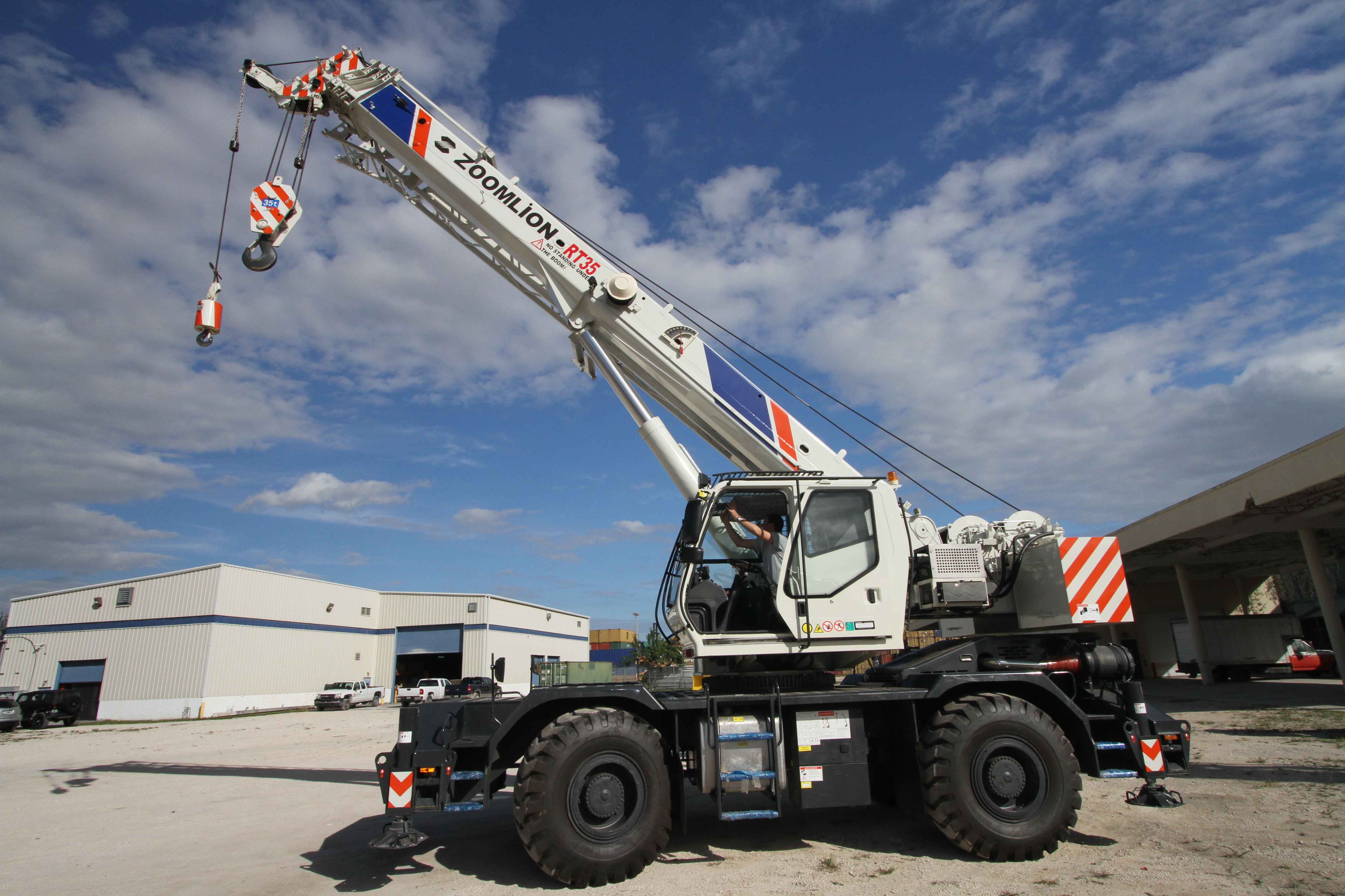 Zoomlion RT35/40 Rough Terrain Crane, 40-Ton Capacity, 102' (31m) 4-Section Full-Power Synchronized Boom Constructed of High-Yield Steel, 5-Sheave Quick-Reeve Boom Tip w/ Removable Rope Guards, 26'-46' (8m-14m) Offsettable Jib, AxleTech Axle, DANA Powershift 6-Speed Transmission, Cummins QSB 6.7 Diesel Engine - Tier 3 Emission Rating (USA/Federal EPA/California ARB/European EU), Greer RCI 777 LMI, Auxilary Winch, Cameras, Auxiliary Lifting Sheave, 35-Ton Hook Block, 6.7-Ton Hook Ball, 5/8" (17mm) Rotation-Resistant Wire Rope, A/C & Heater, Work Light Package, Revolving Amber Light, AM/FM Radio, Front & Rear Lift Lugs, Cab with A/C & Heat, Steering: Front/Rear/All/Crab, Available BTELMA Fleet Management and Monitoring Device.