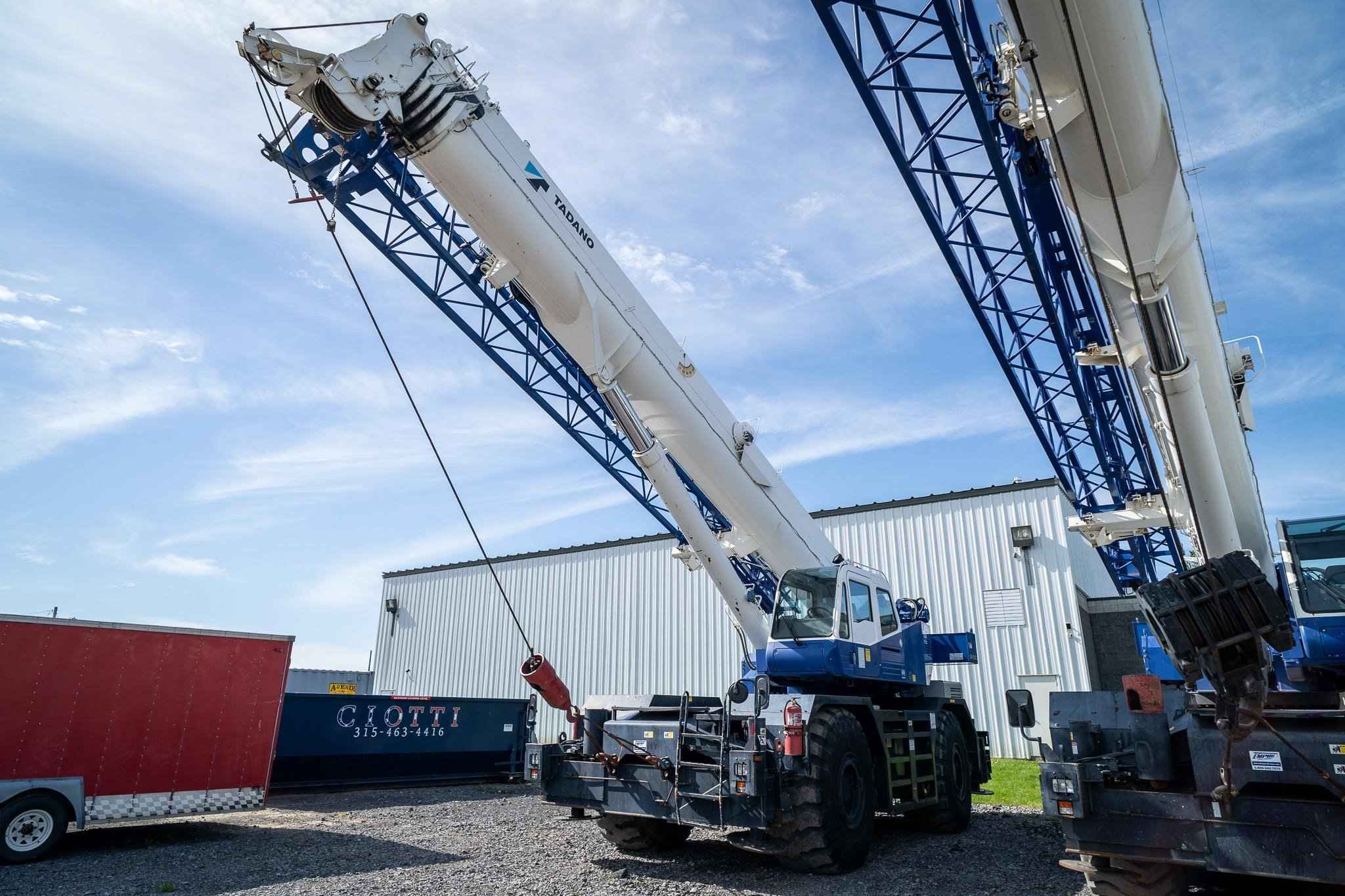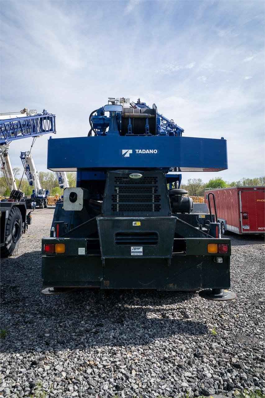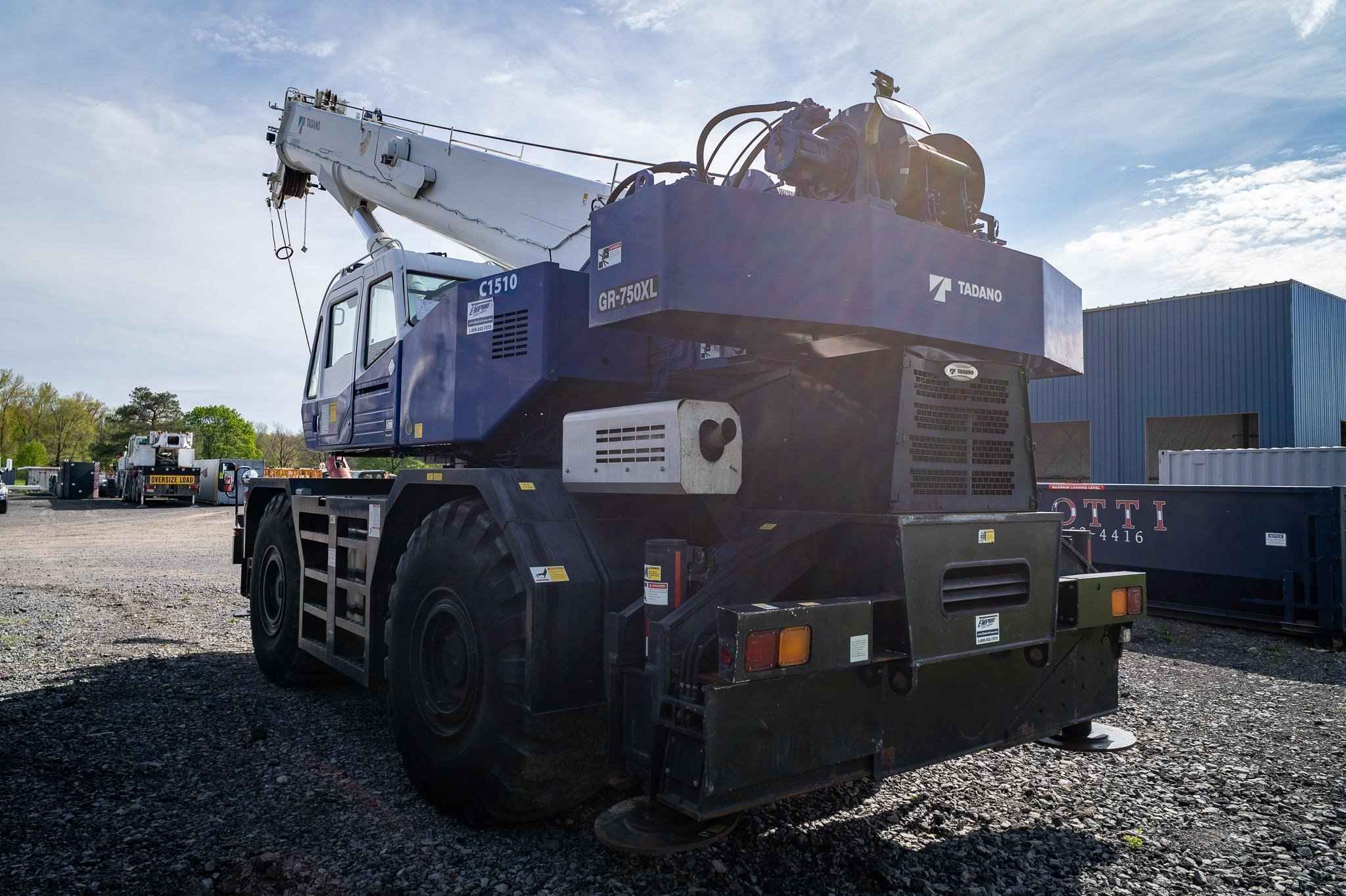 The Tadano GR-750XL is a rough terrain crane with a maximum lifting capacity of 75 tons. There is a maximum boom length of 141.1 feet and a maximum jib length of 58.1 feet. The boom of the GR-750XL is a fully synchronized five section telescoping boom. Two telescoping cylinders, a retraction cable, and an extension cable make up the synchronization system. The boom head has six sheaves to increase the power and stability of the boom. The two-stage jib is a lattice type jib with cylinders that allow for easy storage on the base boom section. The jib head also has a single sheave to increase the power and stability of the jib. The outrigger system is made up of four hydraulic beam and jack outriggers. The beams are controlled independently from the cab.