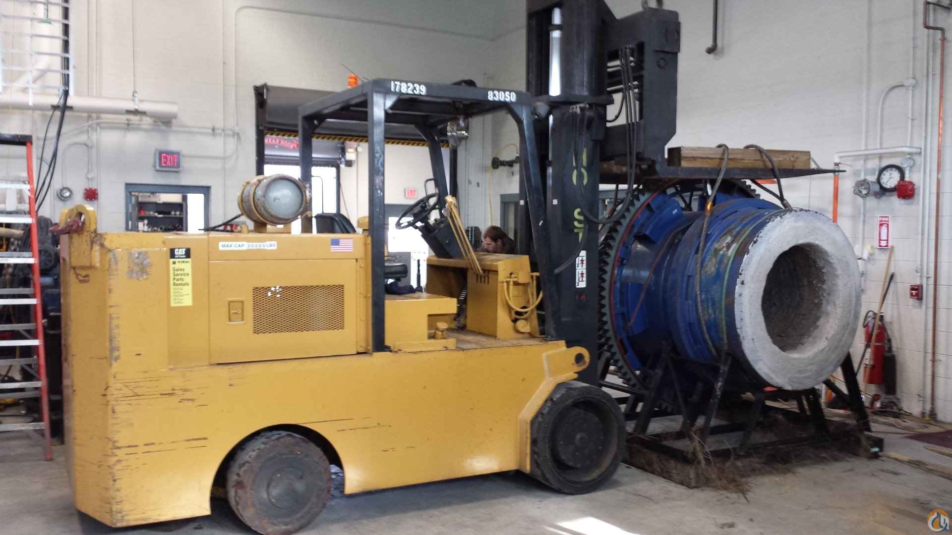 Capacity 30,000# @ 24" load center, Length to face of forks 146" Width 66" Height to top of beacon 105" Wheelbase 84" Weight 40,000#