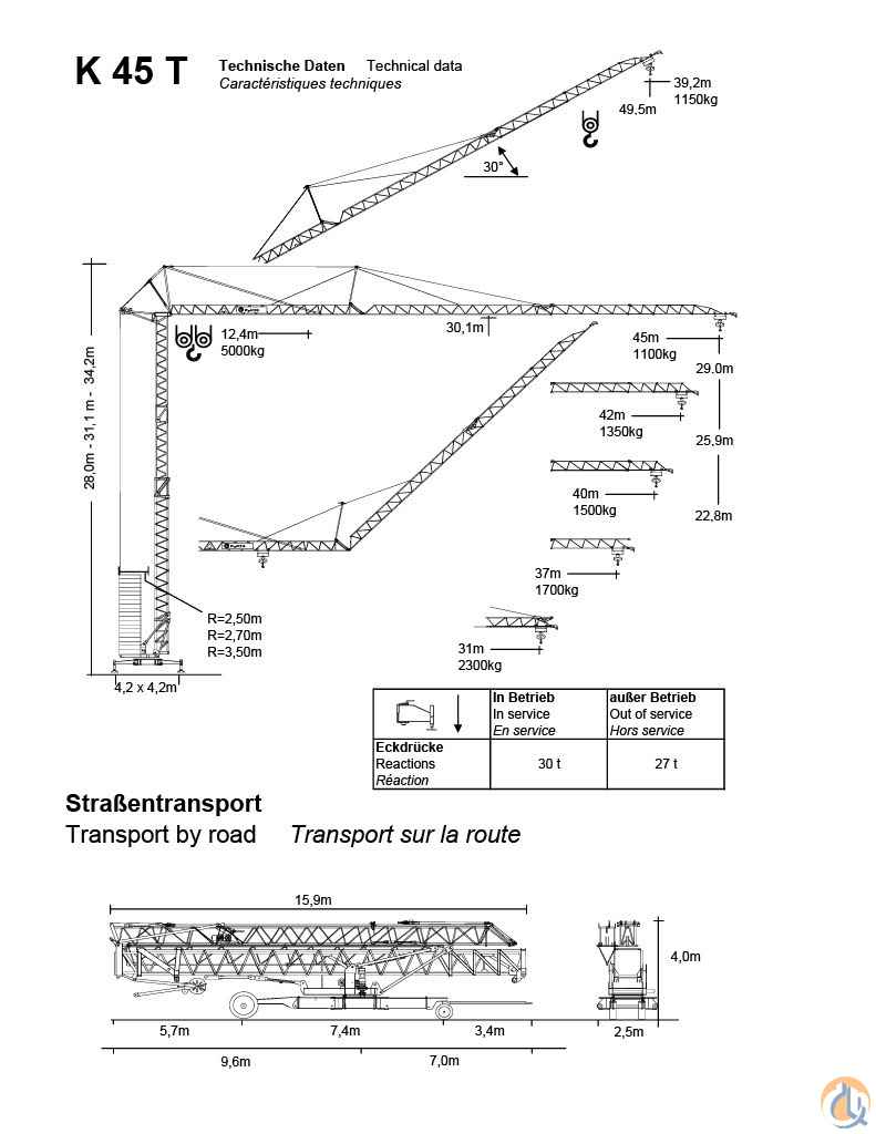 Jib Length: 45m Max lift: 5000kg Max at Jib Tip: 1150kg Height under hook: 29m