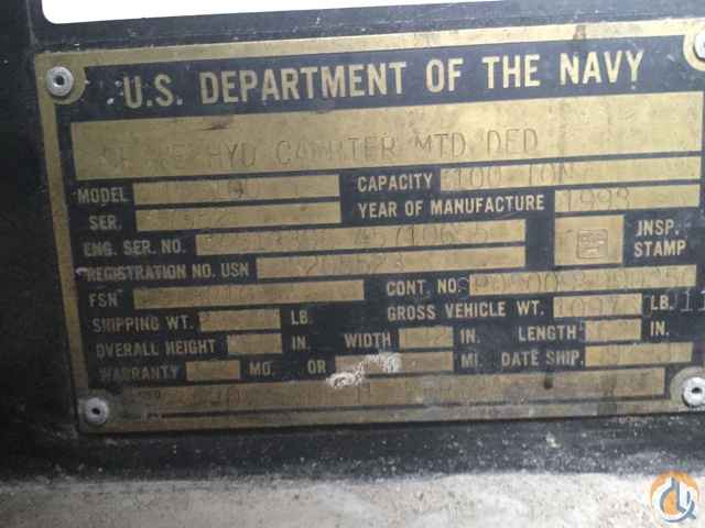 100 US Ton rated hydraulic Truck Mounted Crane, 148' (45 m) of full power boom. Main and Aux Full size hoist, Block & Ball, Rooster Sheave, cummins up and down, Fuller RTX 14710 c Auxiliarary AT 1202 transmission. Ex US Navy Crane. Upper A/C, Carrier Heater, Upper Heater, Anti-Two-Block, Load Moment Indicator, Auto Lube System, 27,450 Counterweight, Cummins Carrier Engine.