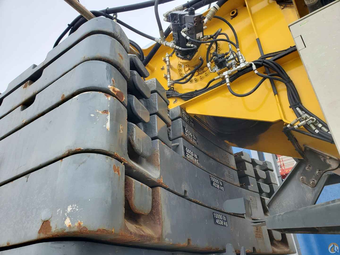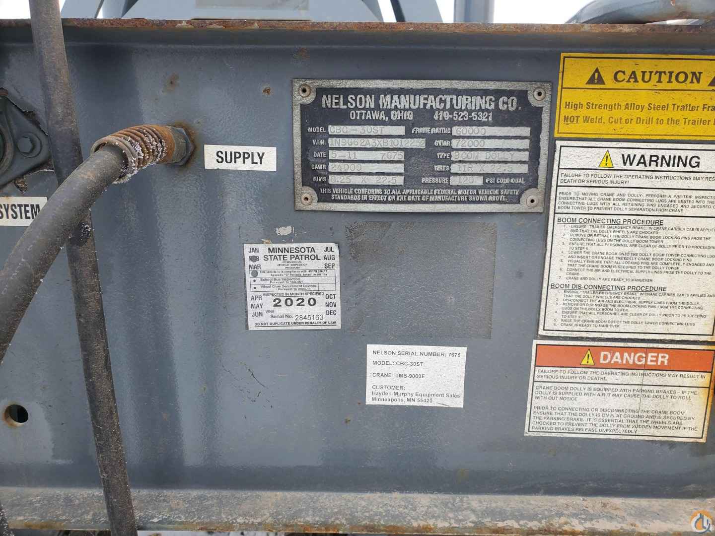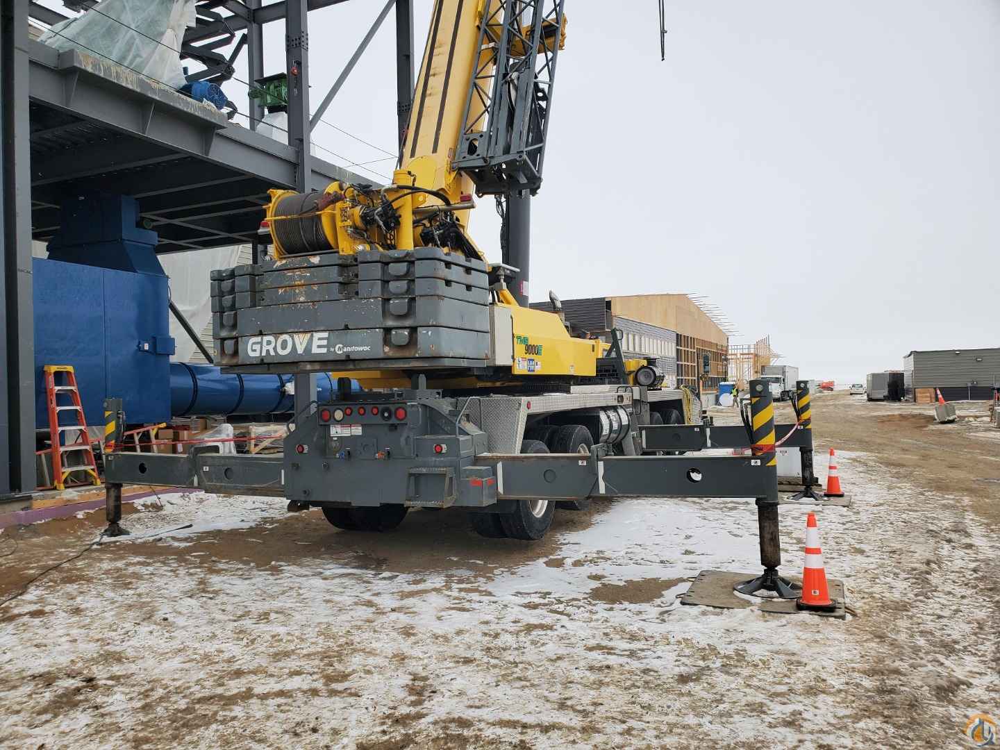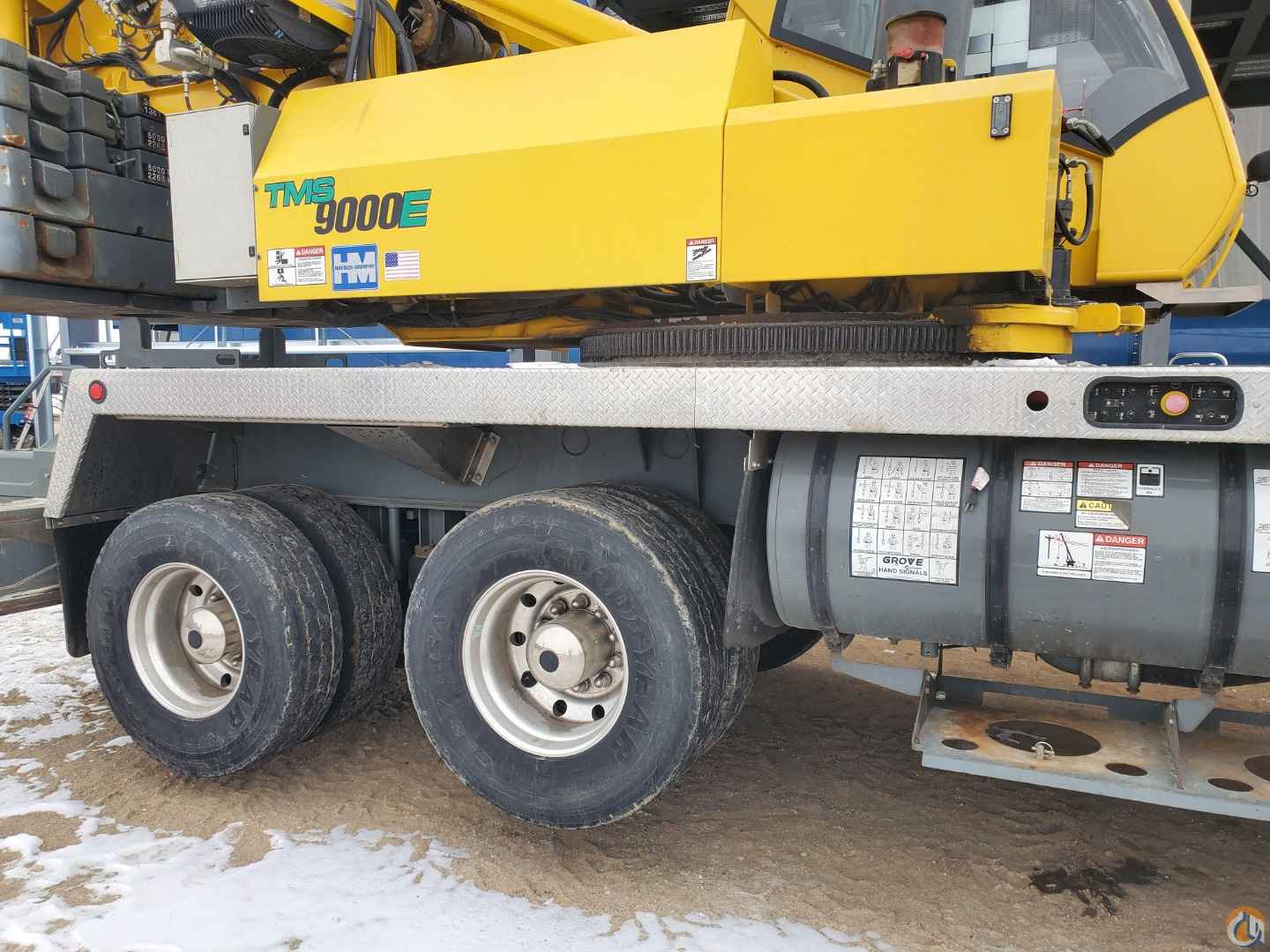 2011 Grove TMS9000E telescopic boom truck crane for sale. This machine is currently located in Minnesota and is ready to ship. This used Grove TMS9000E has a 36-foot to 142-foot full power boom with a 33 to 56-foot jib. The used truck crane features a ball and block, 48,500 lb. counterweight package, auxiliary winch, and a triple axle Nelson boom dolly. The used Grove crane has 21,000 miles, is powered by a Cummins QSM11 402-horsepower engine and has under 10,000 hours. The truck crane rides on 445/65R x 22.5 front, 315/80R x 22.5 rear tires which are in good condition.