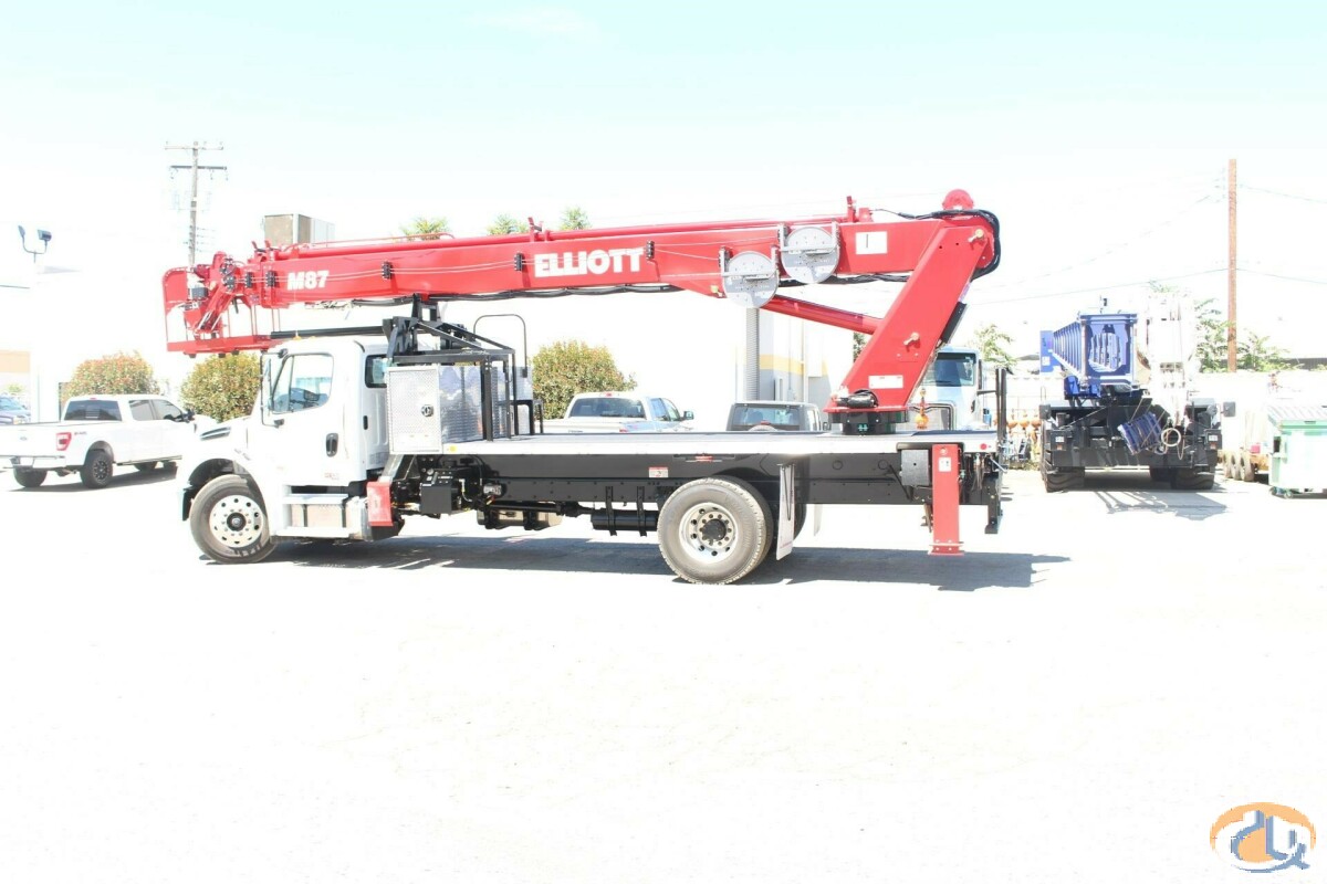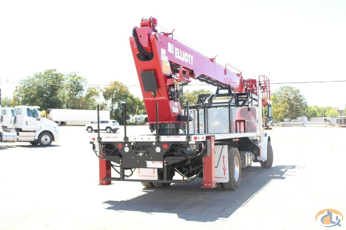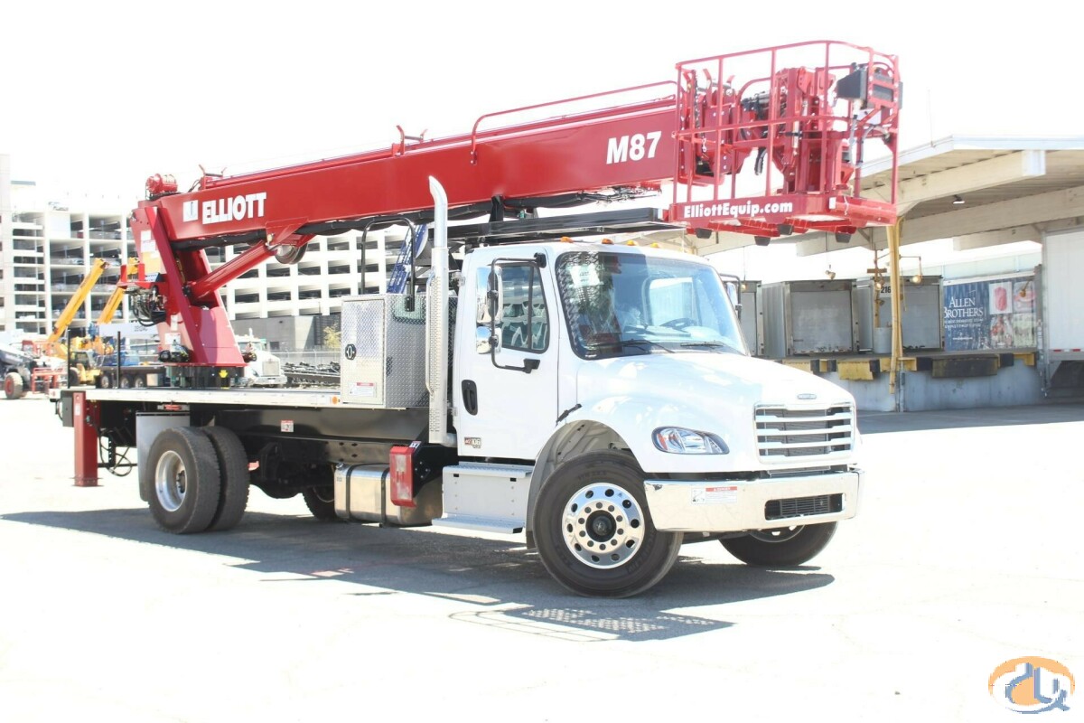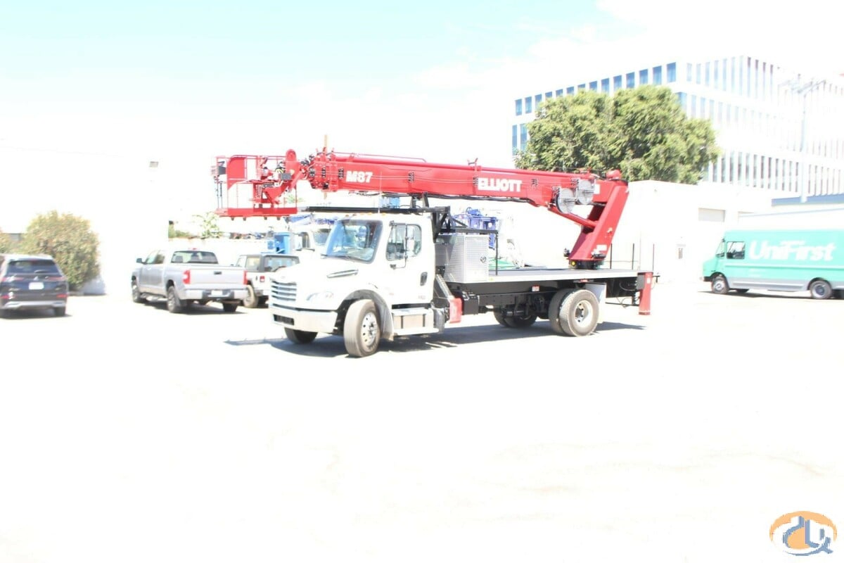 One new Elliott HiReach M87R having a 87' working height. Basic unit includes base assembly supporting a rear mounted rotating turret, hydraulically powered continuous rotation mechanism. Oil reservoir mounted to truck frame with oil. Manual hydraulic controls mounted at turret. Electronic proportional three-stick controls on platform. Base mounted "MH" type hydraulically powered , individually controlled rear main outriggers and "A" style over frame secondary outriggers behind cab. Steel three section proportional telescoping boom powered by single hydraulic extension cylinder and cable drive. Internal cable carrier. Electronic/hydraulic self-leveling and rotating 30" x 54" end hung work platform. Leveling from platform. PTO, pressure gauge, pump, and holding valves on all cylinders. Remote start/stop at upper and lower controls, 12-volt emergency pump with switch at upper and lower controls, PTO hour meter, backup alarm, fire extinguisher, safety triangle kit, and two body harness and lanyards. LED lights to include all bed marker lights, stop, tail and turn. Installed on chassis, tested, checked and ready to operate. Unit certified to ANSI A92.2 for Vehicle-Mounted Elevating and Rotating Aerial Devices. Platform capacity 600 lbs.