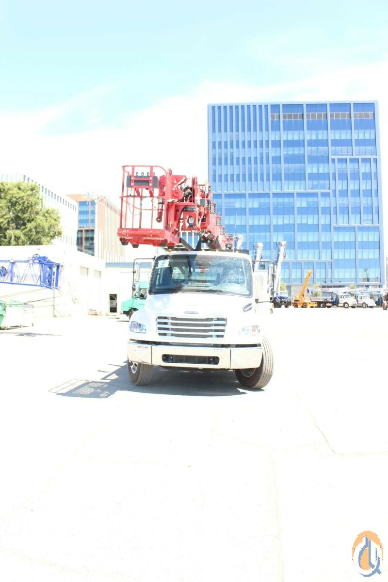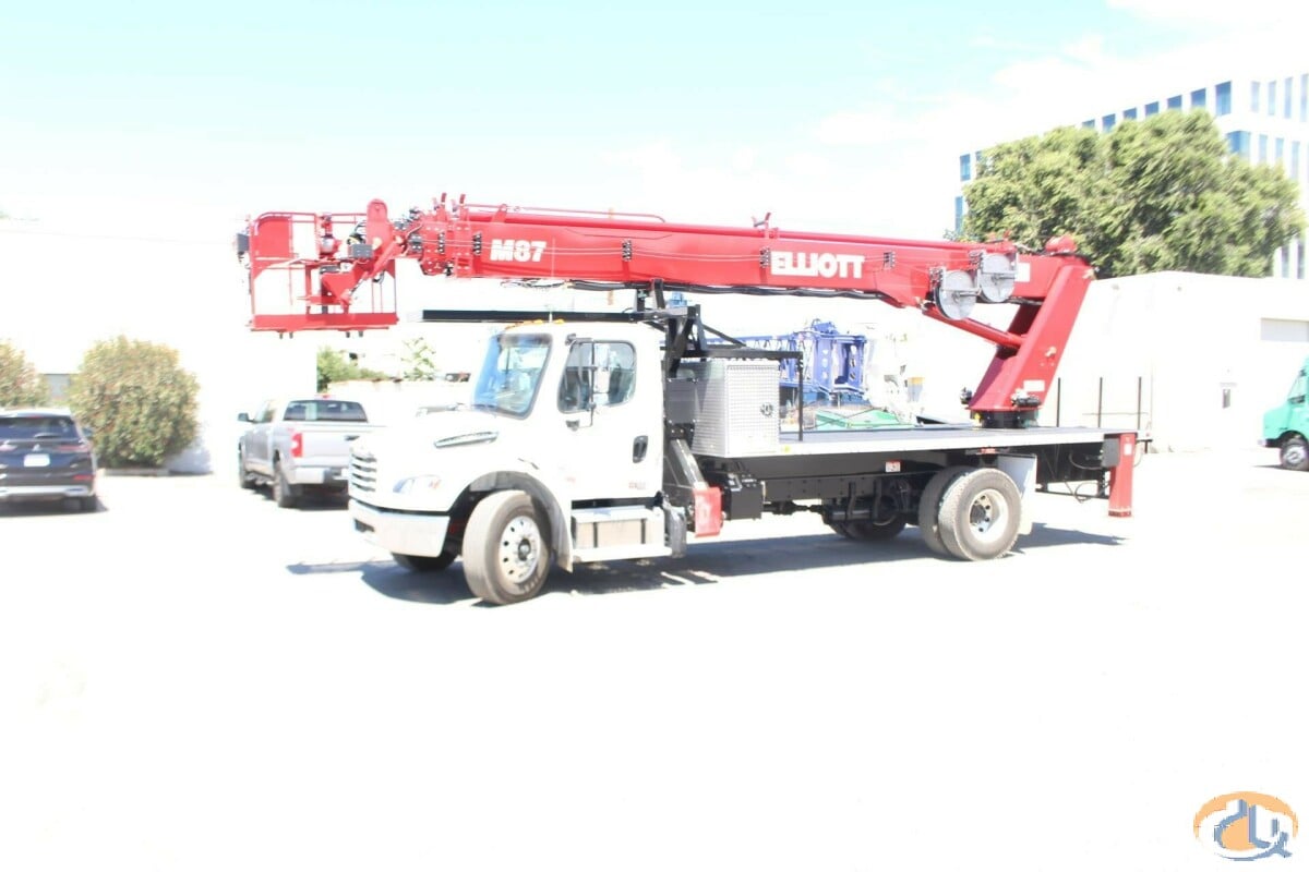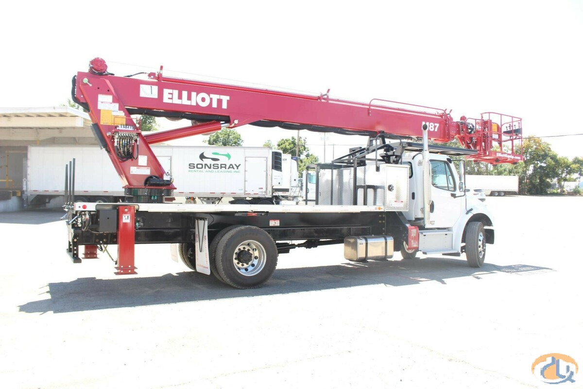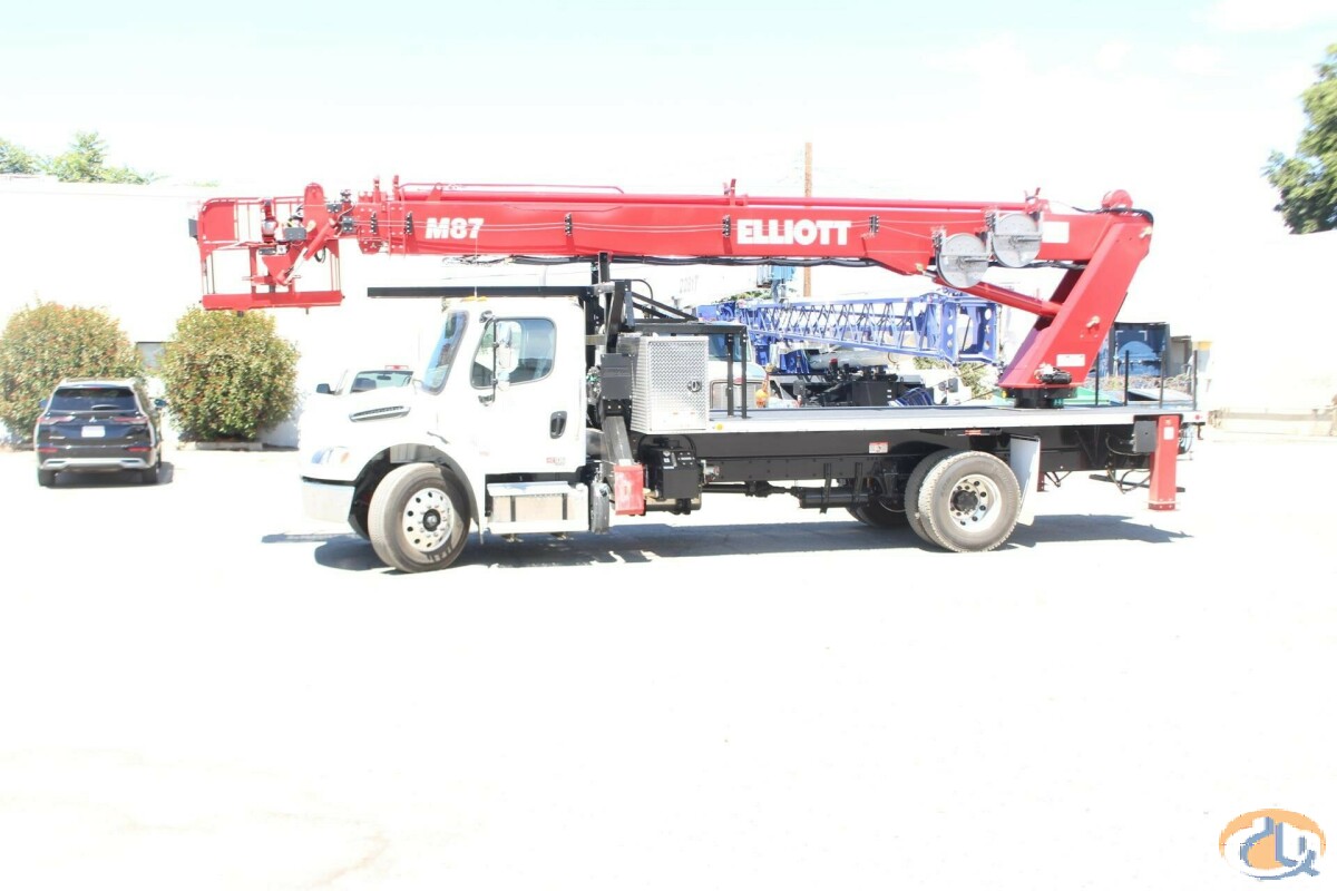 One new Elliott HiReach M87R having a 87' working height. Basic unit includes base assembly supporting a rear mounted rotating turret, hydraulically powered continuous rotation mechanism. Oil reservoir mounted to truck frame with oil. Manual hydraulic controls mounted at turret. Electronic proportional three-stick controls on platform. Base mounted "MH" type hydraulically powered , individually controlled rear main outriggers and "A" style over frame secondary outriggers behind cab. Steel three section proportional telescoping boom powered by single hydraulic extension cylinder and cable drive. Internal cable carrier. Electronic/hydraulic self-leveling and rotating 30" x 54" end hung work platform. Leveling from platform. PTO, pressure gauge, pump, and holding valves on all cylinders. Remote start/stop at upper and lower controls, 12-volt emergency pump with switch at upper and lower controls, PTO hour meter, backup alarm, fire extinguisher, safety triangle kit, and two body harness and lanyards. LED lights to include all bed marker lights, stop, tail and turn. Installed on chassis, tested, checked and ready to operate. Unit certified to ANSI A92.2 for Vehicle-Mounted Elevating and Rotating Aerial Devices. Platform capacity 600 lbs.
